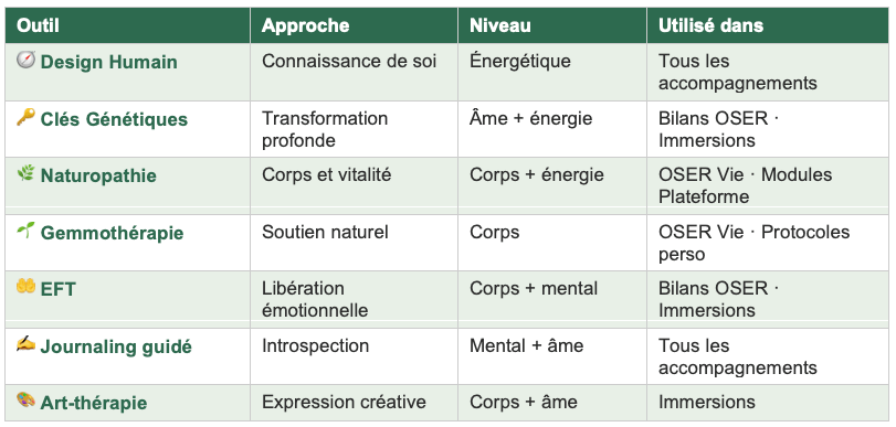 Dans mon accompagnement : Dans les Bilans OSER approfondis et dans les Immersions — pour aller plus loin que le Design Humain pur.